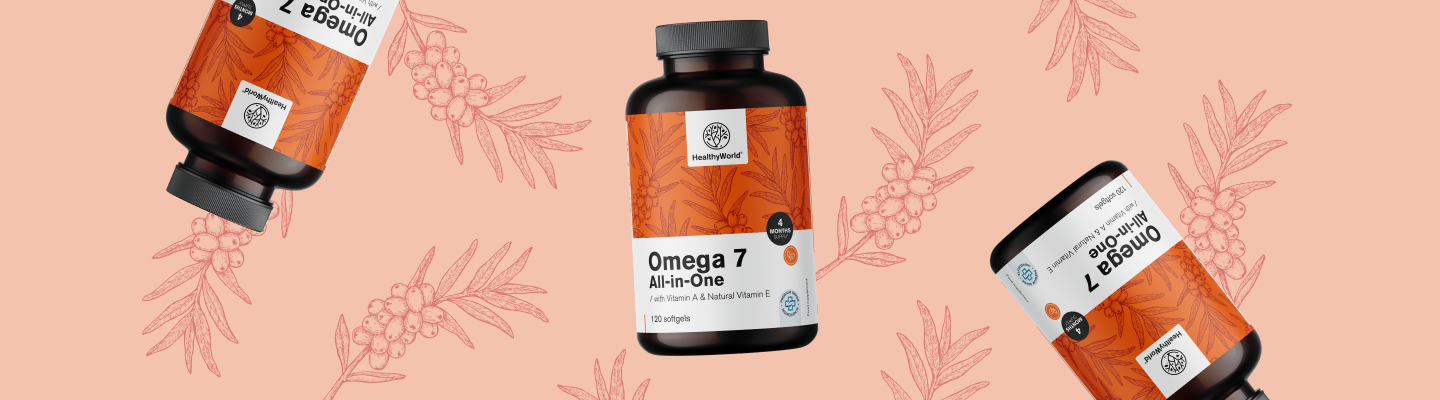 • Ácido palmitoleico (ómega-7): um ácido gordo monoinsaturado que se encontra naturalmente no óleo de espinheiro marítimo, nas nozes de macadâmia e no peixe;