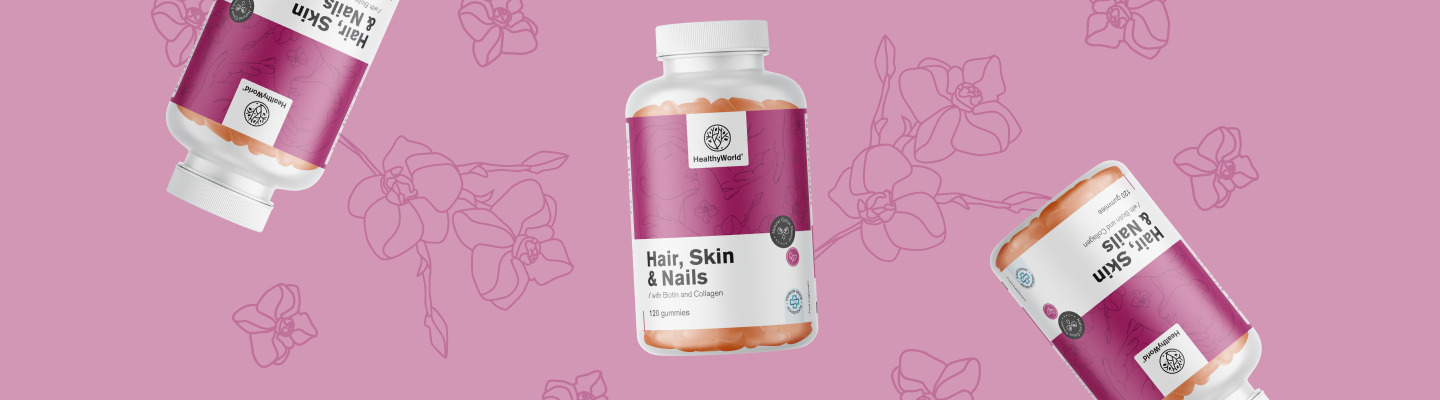 Hair, Skin & Nails são gomas que contêm 3 vitaminas e colagénio, que cuidam de forma otimizada dos cabelos, pele e unhas e ao mesmo tempo: